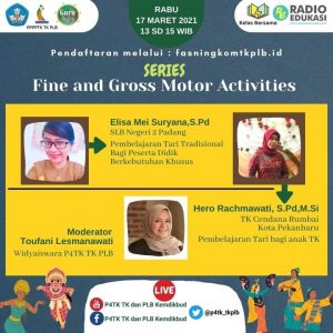 Telah banyak kegiataan yang menunjang keterampilan dan pengembangan kompetensi bagi Guru yang di fasilitasi oleh P4TK TK dan PLB, pada kesempatan ini Ibu Elisa Mei Suryana atau Ibu Ica telah menjadi salah satu pemateri pada kegiatan webinar dengan Tema Gross Motor Activity “Tari”